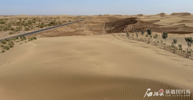 6月13日,在且末縣防風(fēng)治沙基地,一株株紅柳、梭梭及草方格守護(hù)著沙海。