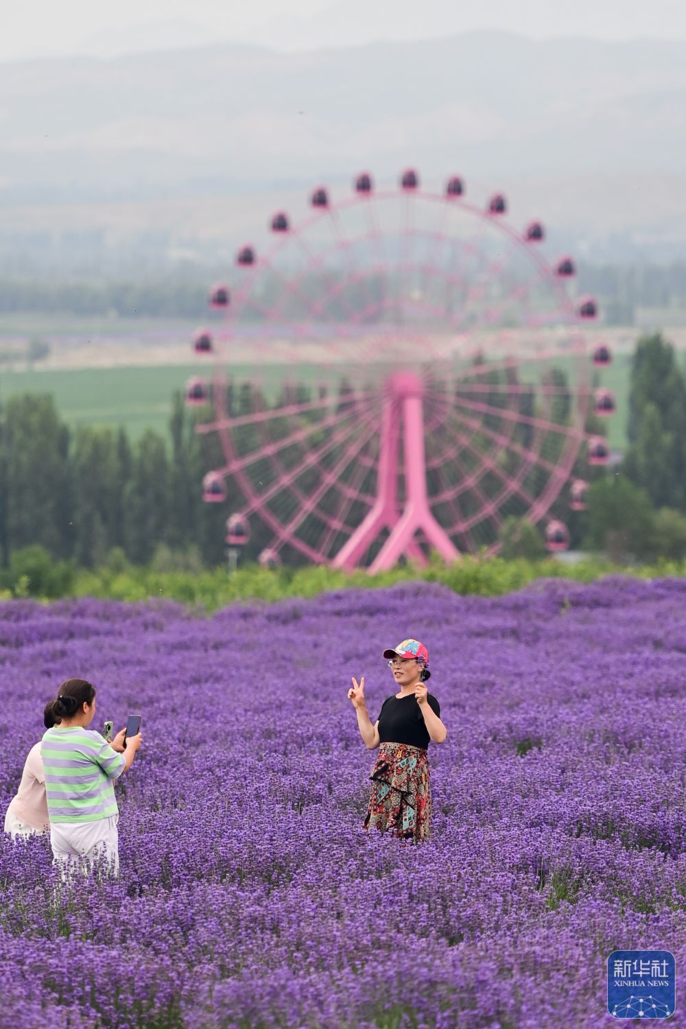 游客在新疆伊犁哈薩克自治州霍城縣解憂公主薰衣草農場游玩(6月14日攝)。
