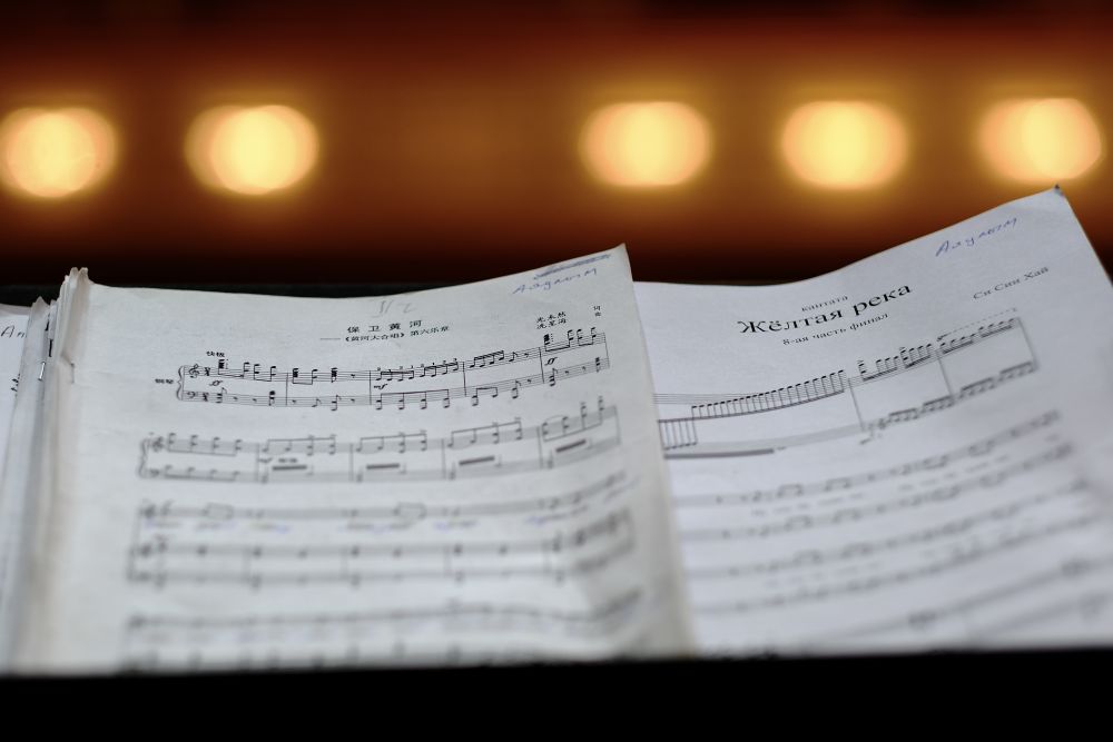 6月12日,在哈薩克斯坦阿拉木圖江布爾國(guó)家音樂(lè)廳拍攝的《黃河大合唱》中、俄文曲譜。新華社記者 鄭開(kāi)君 攝