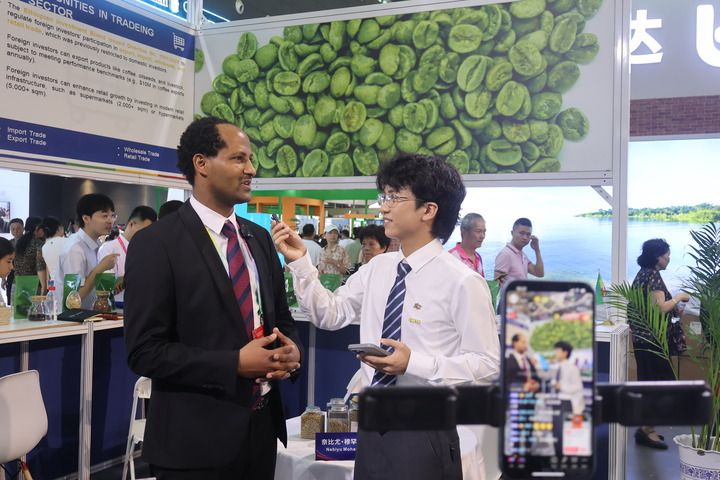 2025年6月14日,在第四屆中國-非洲經貿博覽會上,埃塞俄比亞駐華公使內比尤·穆罕穆德參加現(xiàn)場直播帶貨。新華社記者 周昊瑾 攝