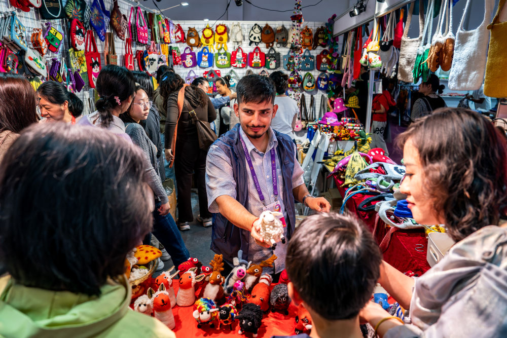 6月21日,第9屆中國—南亞博覽會南亞館尼泊爾展區(qū)的參展商向觀眾推介特色商品。
