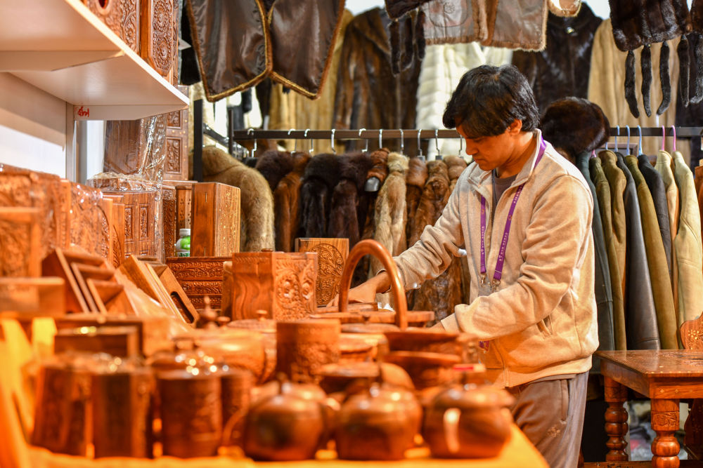 6月21日,一名南亞館巴基斯坦展區(qū)的展商在擺放木制手工藝品。