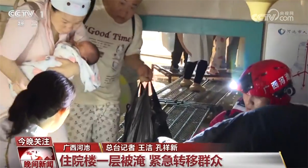 這兩天,廣西河池多地遭遇強降雨天氣。河池市人民醫(yī)院住院部大樓一層出現(xiàn)嚴(yán)重積水,幾百名住院的病人和陪護家屬需要轉(zhuǎn)移,救援人員迅速行動起來。