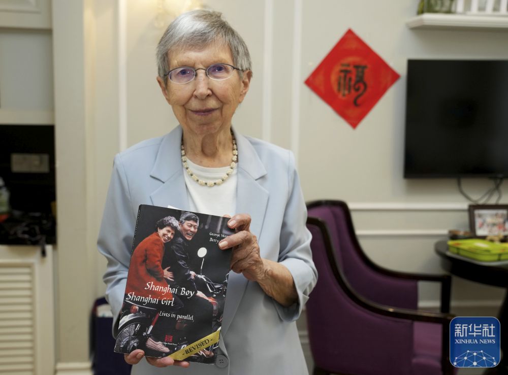2025年6月13日,白麗詩展示自己與丈夫王正文合著的英文版回憶錄《上海男孩,上海女孩》。