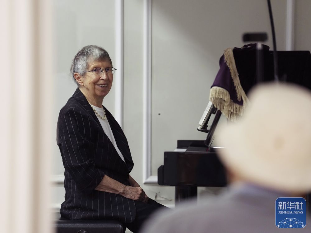 2025年6月13日,白麗詩在養(yǎng)老院的多功能廳彈鋼琴。