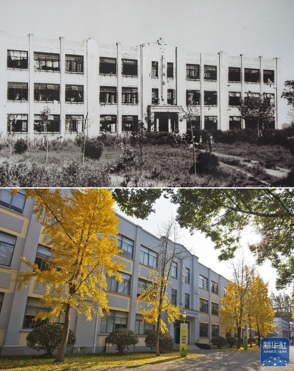 上圖是上海龍華集中營的E棟大樓;下圖是上海中學(xué)校園內(nèi)的先棉堂,曾經(jīng)的E棟大樓(資料照片)。新華社發(fā)(上海中學(xué)供圖)