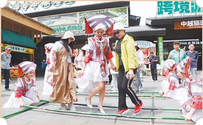 游客在中越德天(板約)瀑布跨境旅游合作區(qū)體驗(yàn)民俗。
