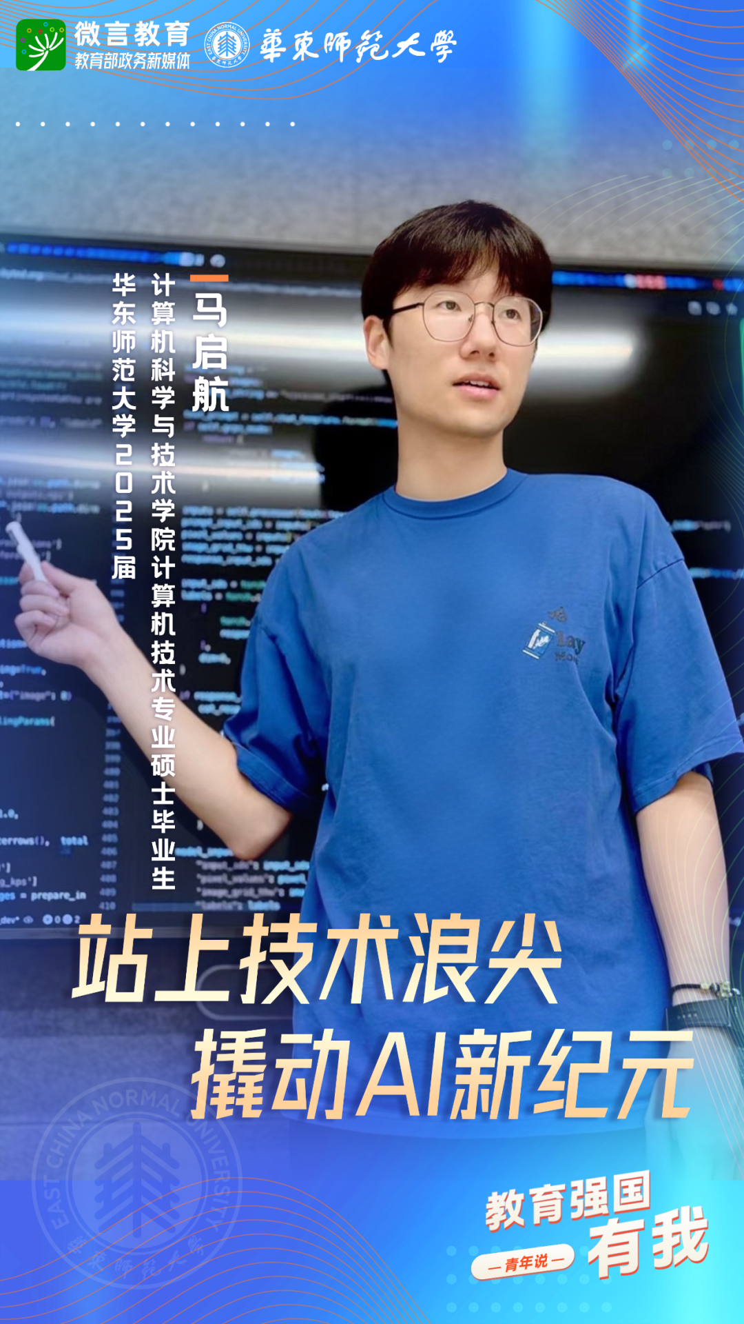 習(xí)近平總書(shū)記強(qiáng)調(diào),希望廣大青年堅(jiān)定理想信念,厚植家國(guó)情懷,練就過(guò)硬本領(lǐng),發(fā)揚(yáng)奮斗精神,到祖國(guó)和人民最需要的地方發(fā)光發(fā)熱,為中國(guó)式現(xiàn)代化建設(shè)貢獻(xiàn)青春力量。教育強(qiáng)國(guó)建設(shè),青年何為?教育部政務(wù)新媒體推出“教育強(qiáng)國(guó),有我!”網(wǎng)絡(luò)主題宣傳活動(dòng)之“青年說(shuō)(報(bào)國(guó)篇)”系列,展現(xiàn)青年學(xué)子將個(gè)人理想融入國(guó)家發(fā)展的青春擔(dān)當(dāng)。今天,跟教育小微通過(guò)1個(gè)視頻和1組海報(bào),一起來(lái)看華東師范大學(xué)學(xué)子如何“向新而行”——