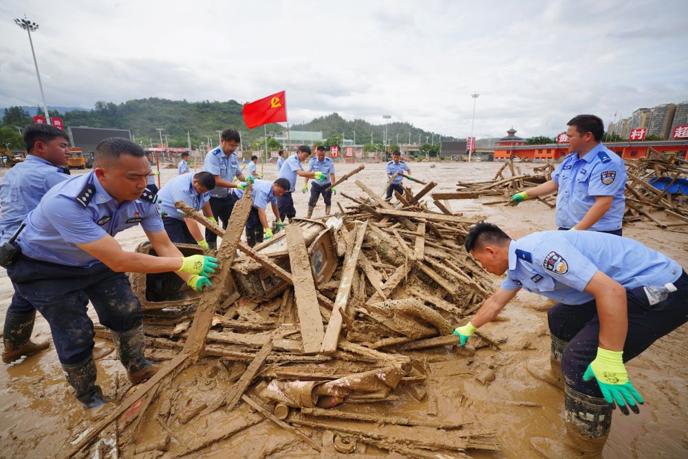 6月29日,在貴州省榕江縣“村超”球場(chǎng),來(lái)自丹寨縣公安局的黨員民警潘建航(左二)和同事一起清理因洪災(zāi)受損的球場(chǎng)設(shè)施。新華社發(fā)(楊武魁攝)