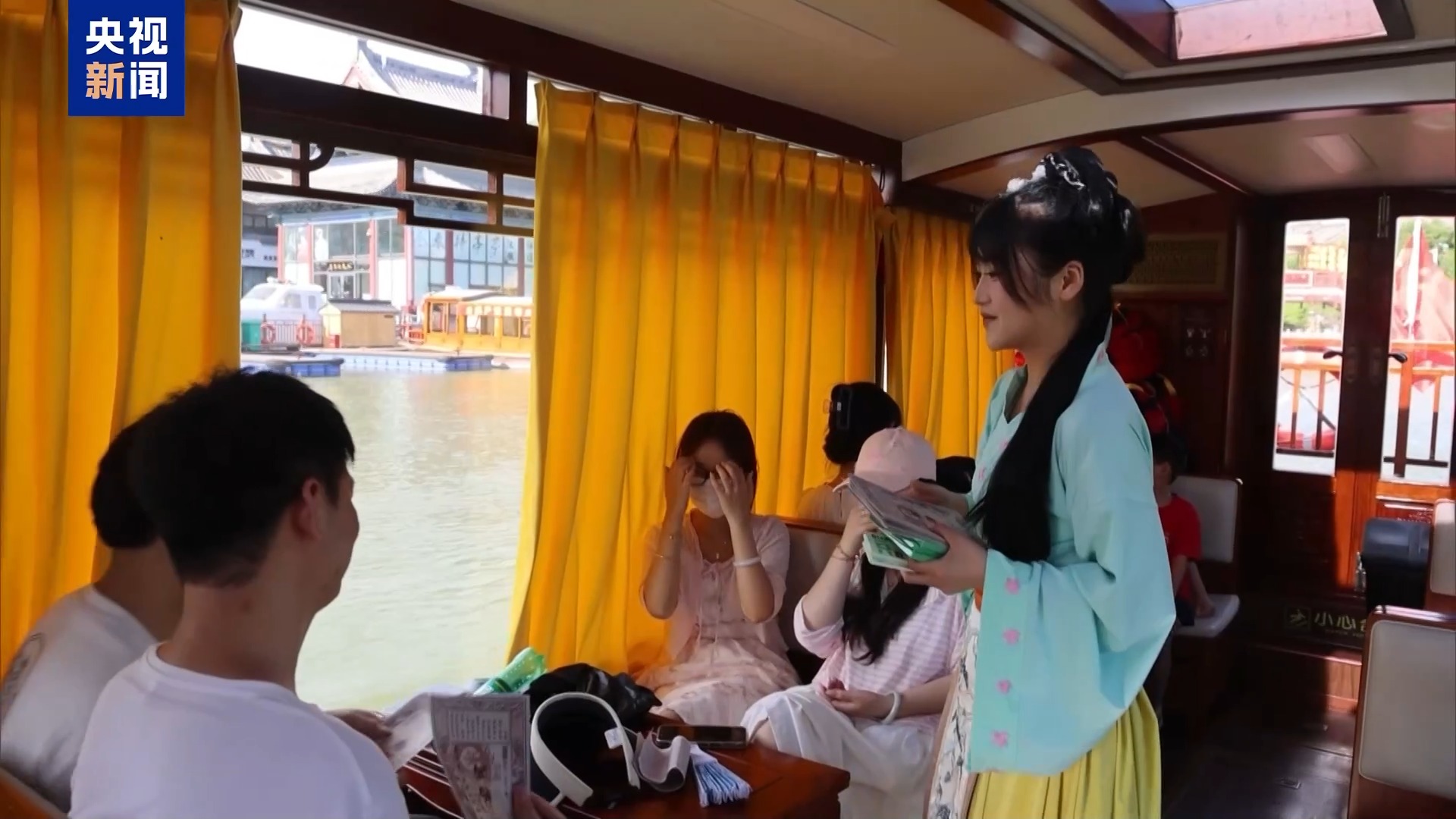 在河南開封,游客能坐船體驗“宋朝人的一天”,船上設有互動詩詞小游戲,市內的八大景區(qū)通過汴河水道“串珠成鏈”,吸引游客參與其中。
