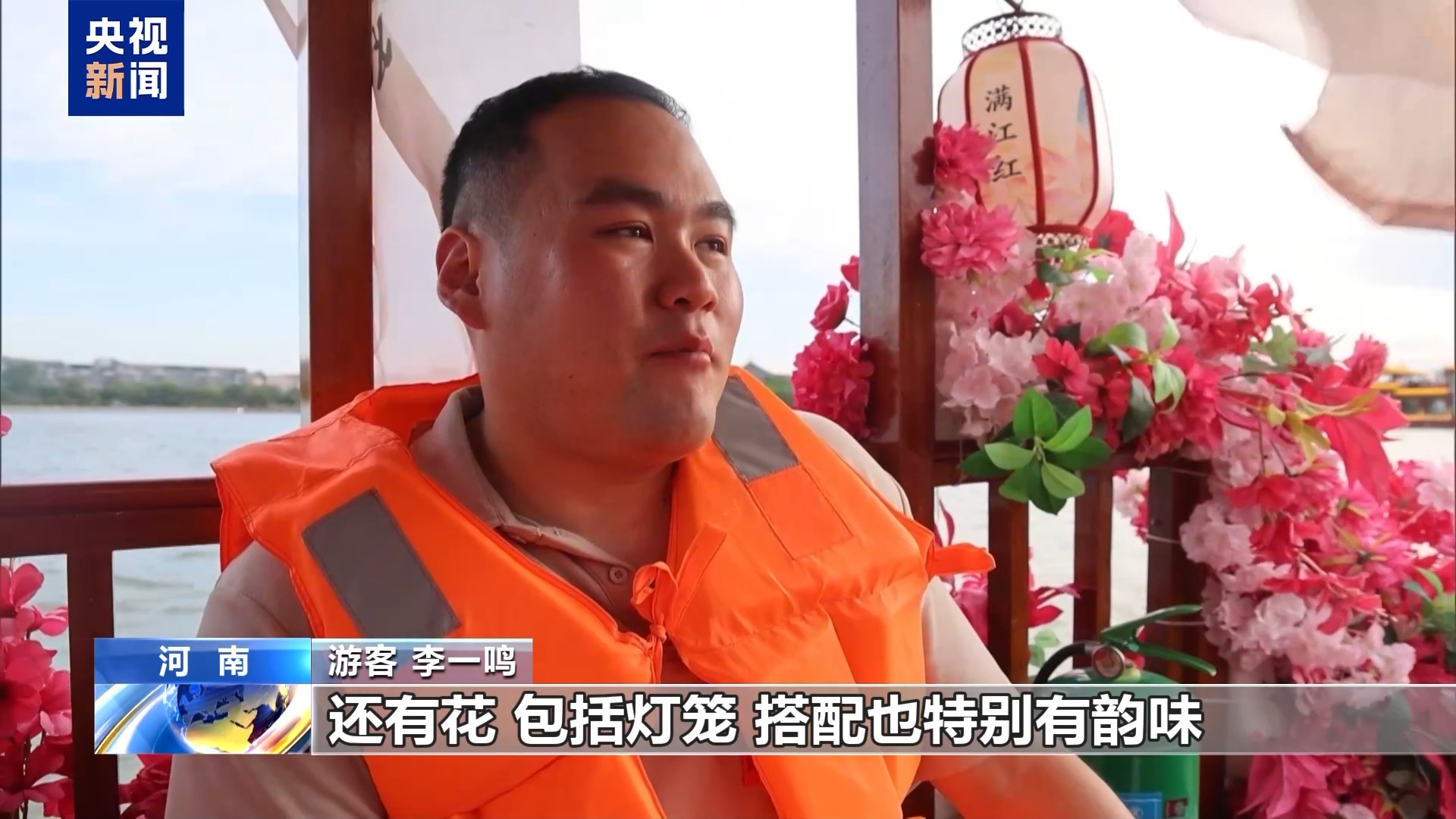 游客 李一鳴:置身于這個歷史古城之中,就像《清明上河圖》里面的人物一樣。船上裝點的古典詩詞,還有花,包括燈籠,搭配特別有韻味。