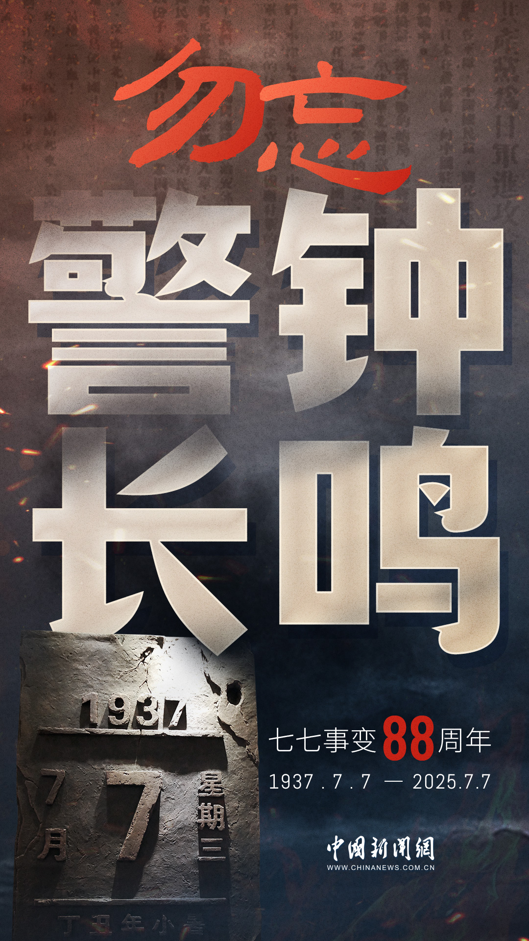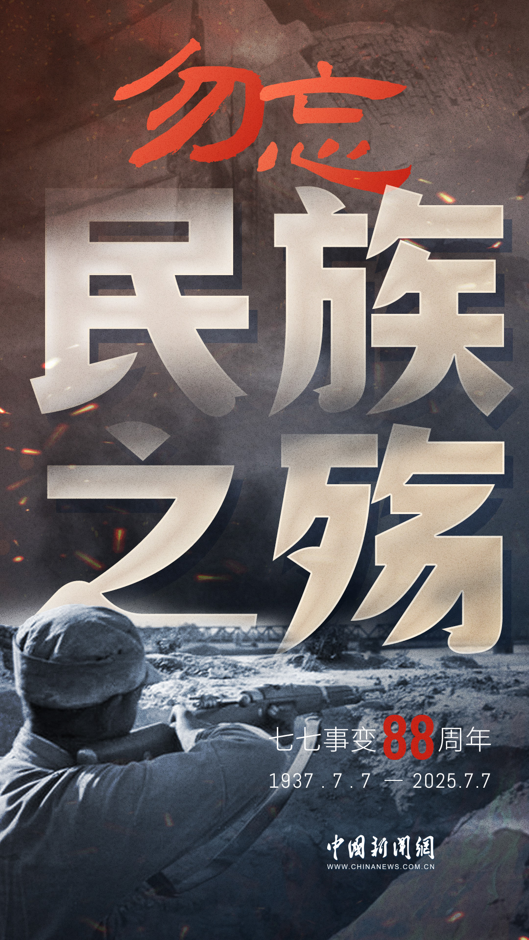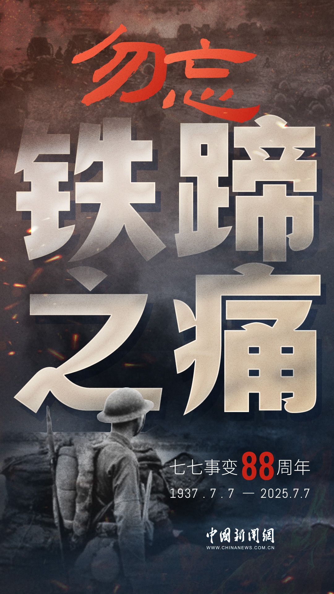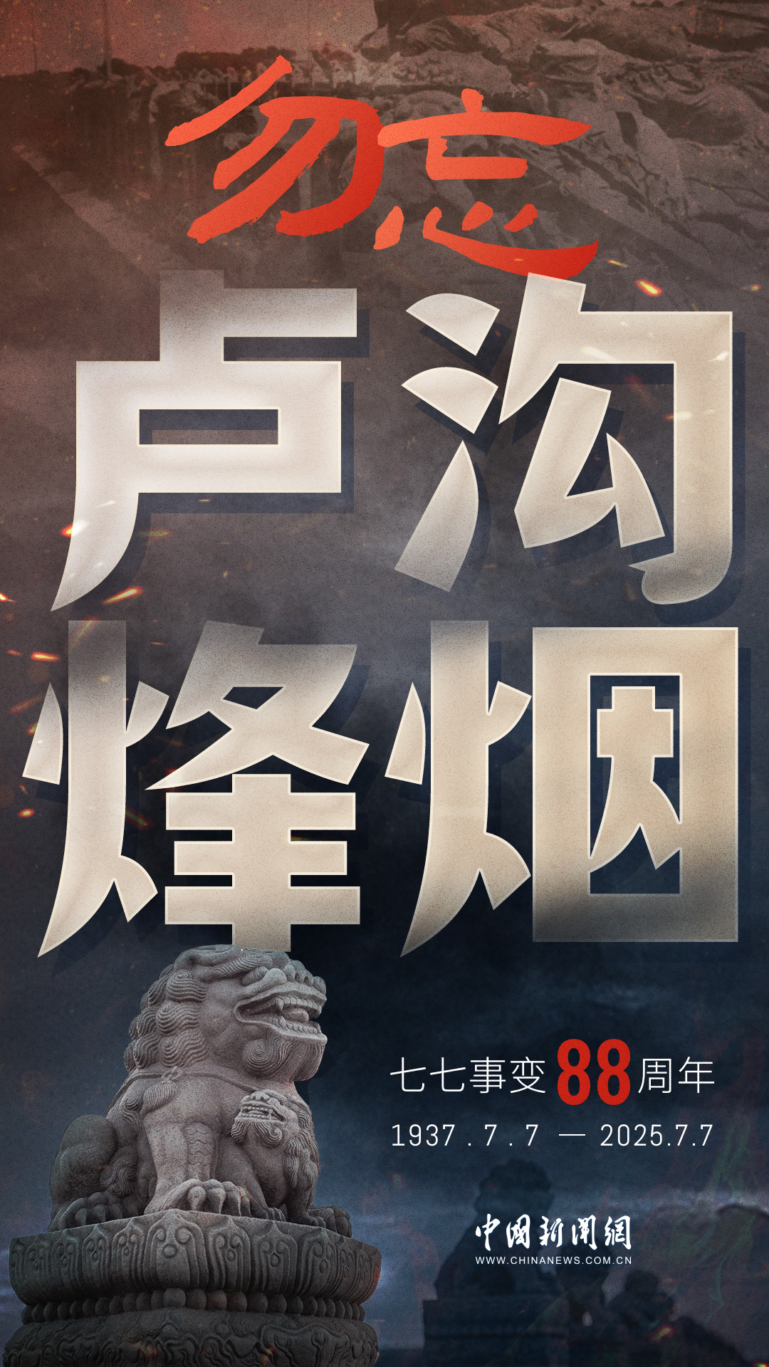 1937年7月7日,盧溝橋的槍聲撕裂長(zhǎng)夜,中華兒女赴湯蹈火,以血肉之軀筑起御敵長(zhǎng)城。88載歲月流轉(zhuǎn),硝煙雖散,彈痕猶在,那段浸透血淚的歷史,是刻在民族記憶里永不褪色的烙印。今日山河錦繡,國(guó)泰民安,正是先烈用生命換來(lái)的盛世。七七事變88周年,致敬英烈,銘記國(guó)殤,吾輩自強(qiáng),護(hù)山河無(wú)恙!