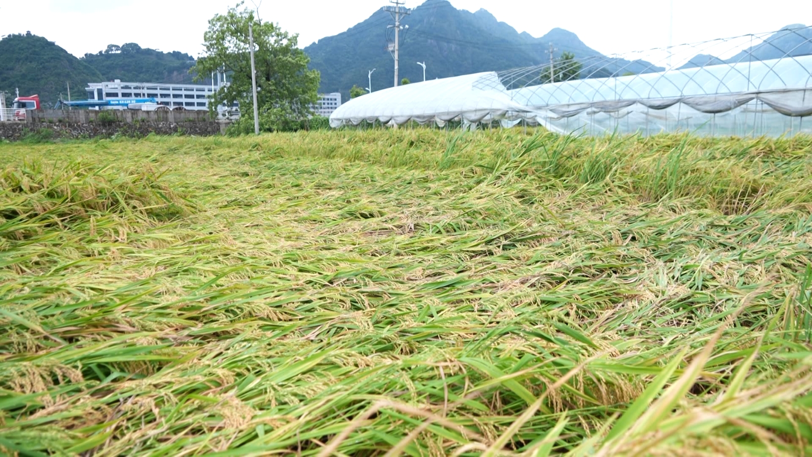 現(xiàn)場,大棚倒塌、薄膜被吹翻,成片的成熟早稻貼伏在地面。種植戶周永乾踩著泥濘,忙不迭給稻田排水,滿臉焦急?!敖衲觊L勢比前幾年都好,平均畝產(chǎn)一千斤以上,開始都高興的很,沒想到快收割的時(shí)候刮臺(tái)風(fēng)。我們一夜都沒睡,在家里睡不著,現(xiàn)在只剩下山邊的四十來畝稻子,其他的都倒平了。”