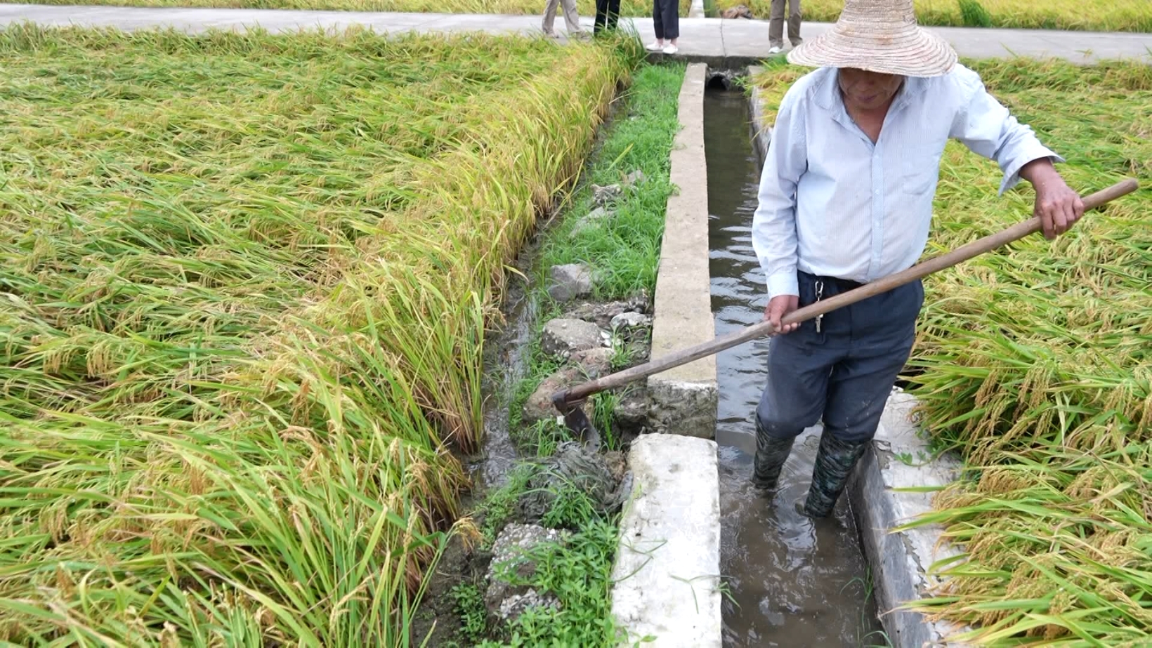 因?yàn)楹献魃绲乃咎镞€處于抽穗灌漿期,因此田里還需留一部分水,有利于水稻后期生長。按照農(nóng)技干部的指導(dǎo),合作社負(fù)責(zé)人和工人將水稻田的積水排出大部分,接下來等天氣晴好,他們就會(huì)對倒伏的水稻及時(shí)采取捆綁扶正措施,盡量減少在高溫高濕氣候條件下水稻接觸積水會(huì)出現(xiàn)發(fā)芽、品質(zhì)降低的情況。