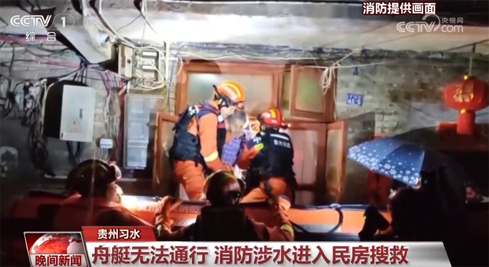8日晚到9日清晨,貴州遵義習水縣遭遇強降雨襲擊,導致縣城多處低洼地帶積水嚴重,道路被淹、房屋進水,多名群眾被困。當?shù)叵啦块T展開救援,但因部分地區(qū)通道狹窄,舟艇無法通行,消防人員將繩索系在身上,涉水進入民房展開搜救。