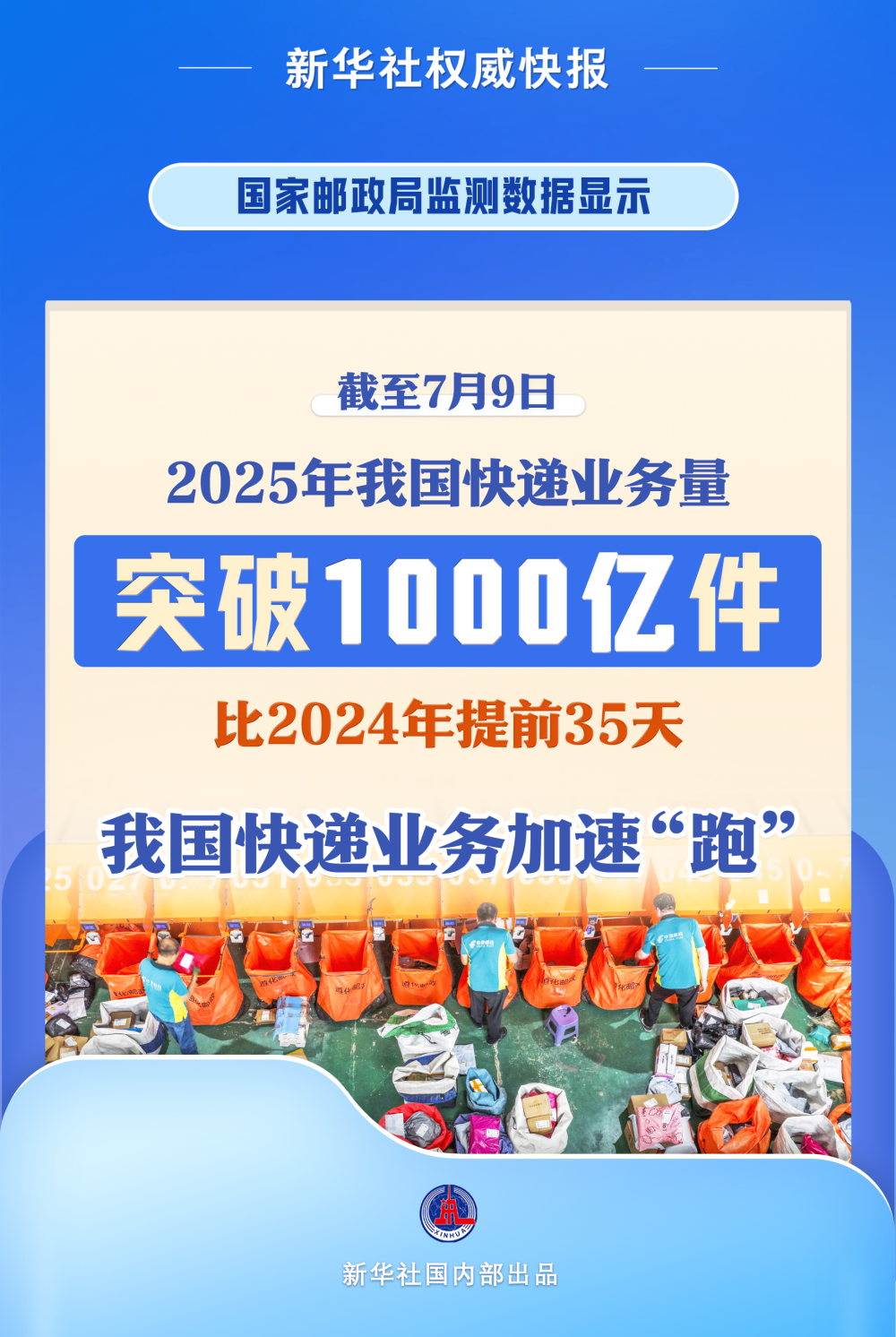 國家郵政局監(jiān)測(cè)數(shù)據(jù)顯示,截至7月9日,今年我國快遞業(yè)務(wù)量突破1000億件,比2024年提前35天。