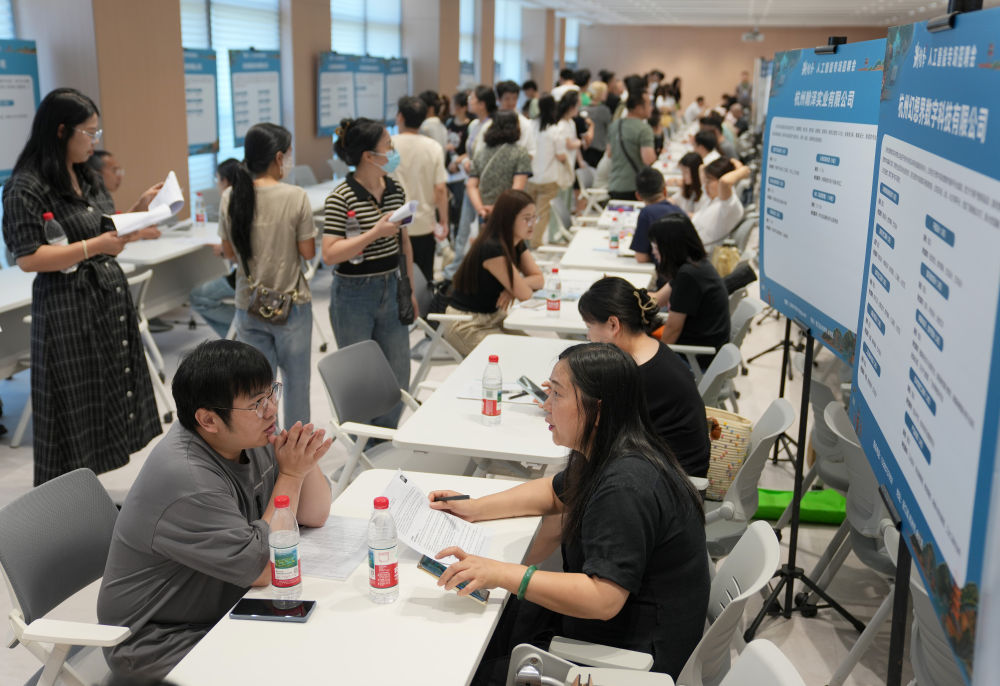 6月28日,求職者與招聘代表在2025年杭州市人工智能專場(chǎng)招聘會(huì)上洽談。新華社記者 韓傳號(hào) 攝