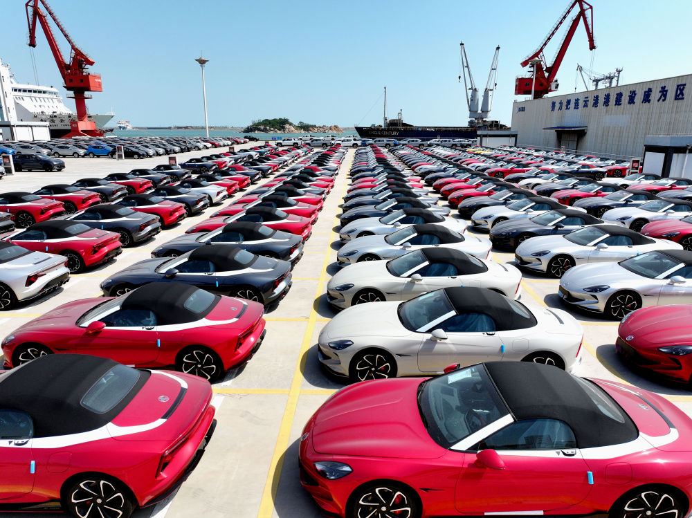 6月16日,在江蘇省連云港港東方港務(wù)分公司碼頭,大批車輛等待裝船外運(yùn)(無人機(jī)照片)。新華社發(fā)(王春攝)
