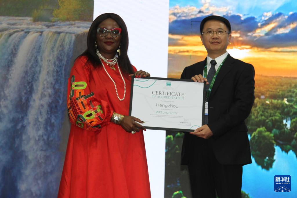 7月24日,在津巴布韋維多利亞瀑布城開幕的《濕地公約》第十五屆締約方大會(huì)上,《濕地公約》秘書長(zhǎng)穆松達(dá)·蒙巴為中國(guó)浙江杭州代表頒發(fā)“國(guó)際濕地城市”證書。新華社發(fā)(塔法拉攝)