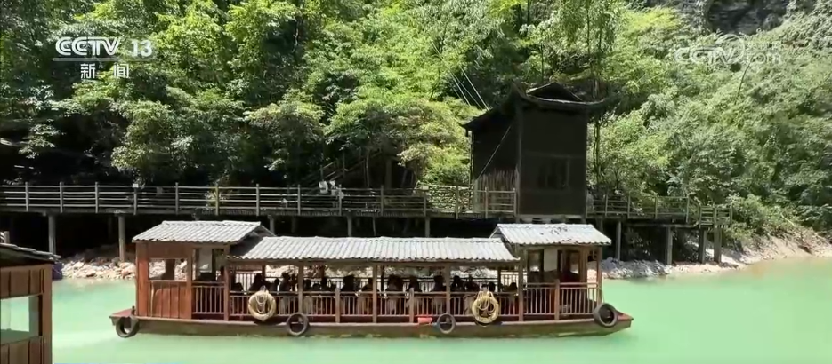 乘船賞景也成為景區(qū)一大特色,游客們乘坐游船緩緩穿梭于澄澈的湖面上,四周峽谷青山環(huán)抱,石壁瀑布傾瀉而下,兩岸景色蔚為壯觀。微風(fēng)拂來(lái),吹散夏日的燥熱,讓人沉浸在如詩(shī)如畫(huà)的美景中,心曠神怡。