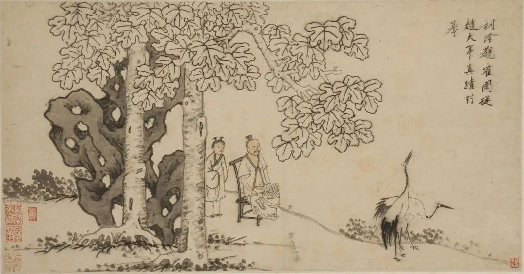 △明 沈周(款)山水人物大冊(cè)(之六 桐陰觀鶴),天津博物館藏。