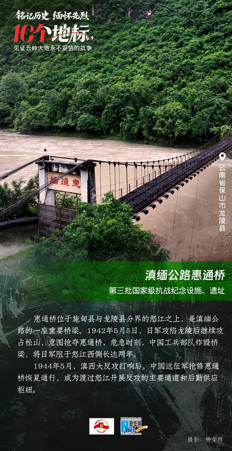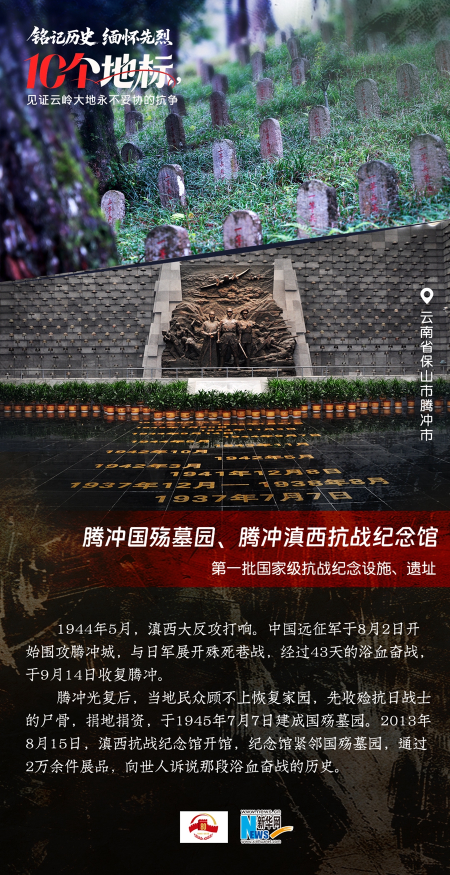 ??80年過去,曾經(jīng)的戰(zhàn)場(chǎng)硝煙雖散,但英氣永存。在國務(wù)院公布的前三批國家級(jí)抗戰(zhàn)紀(jì)念設(shè)施、遺址名錄中,云南省共有10個(gè),分別為騰沖國殤墓園、騰沖滇西抗戰(zhàn)紀(jì)念館,龍陵抗日戰(zhàn)爭(zhēng)紀(jì)念館,國立西南聯(lián)合大學(xué)舊址,抗戰(zhàn)勝利紀(jì)念堂,松山戰(zhàn)役舊址,南洋華僑機(jī)工回國抗日紀(jì)念碑,怒江駝峰航線紀(jì)念館,施甸縣抗日江防遺跡群,滇緬公路惠通橋,滇西抗日戰(zhàn)爭(zhēng)紀(jì)念碑。它們承載著國人共同的歷史記憶與民族情感,也為我們學(xué)習(xí)和傳承抗戰(zhàn)精神提供了現(xiàn)實(shí)條件。