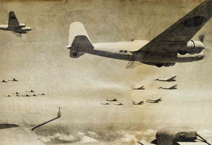 這是侵華日軍大編隊(duì)轟炸機(jī)群飛向重慶,準(zhǔn)備進(jìn)行轟炸(資料照片,翻拍)。新華社發(fā)