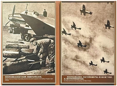 中國人民抗日戰(zhàn)爭紀念館中展示的蘇聯(lián)援華航空隊老照片。左側(cè)照片為蘇聯(lián)援華航空隊成員為飛機裝彈,準備轟炸被日軍占領的臺北松山機場。右側(cè)照片為1938年中蘇空軍參加徐州會戰(zhàn)。