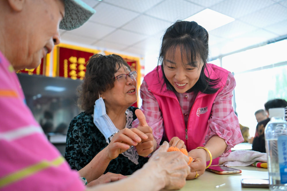 在天津市河西區(qū)賓西樓居家養(yǎng)老服務(wù)中心,劉緩緩(右)鼓勵(lì)一名在“老年大學(xué)”課上制作手工飾品的老人(5月23日攝)。新華社記者 孫凡越 攝