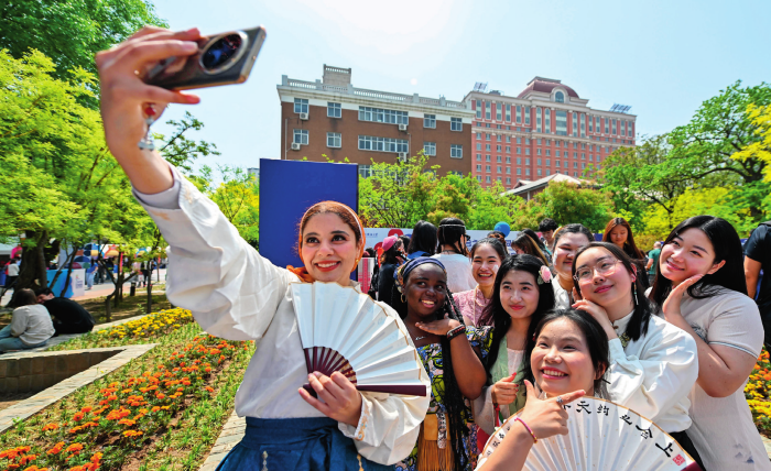 中外青年在以“上合之約天外同彩”為主題的天津外國語大學(xué)第八屆國際文化節(jié)上合影留念(2025 年 4 月 20 日攝)孫凡越攝 / 本刊