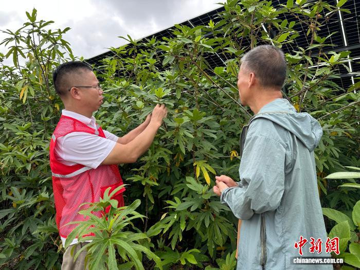 烈日下,光伏板下溫潤(rùn)小氣候讓五指毛桃長(zhǎng)得格外舒展。陽(yáng)光被“折疊”利用,荒坡石礫地成了寶地。