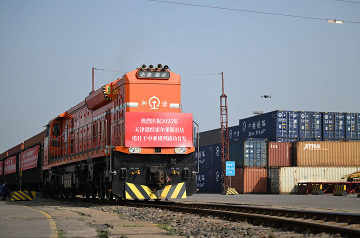 2025年首列天津港經(jīng)霍爾果斯直達(dá)塔什干的中亞班列從天津港物捷三堆場(chǎng)發(fā)車(2025年5月20日攝)。