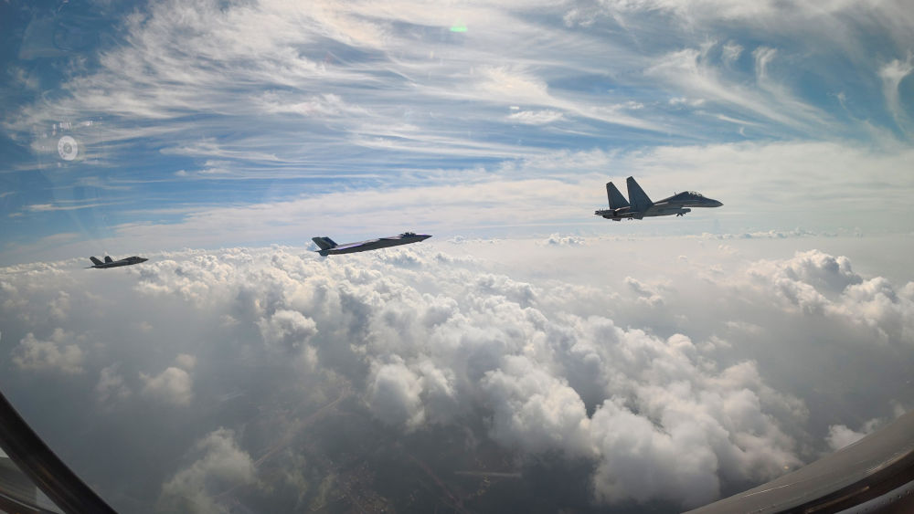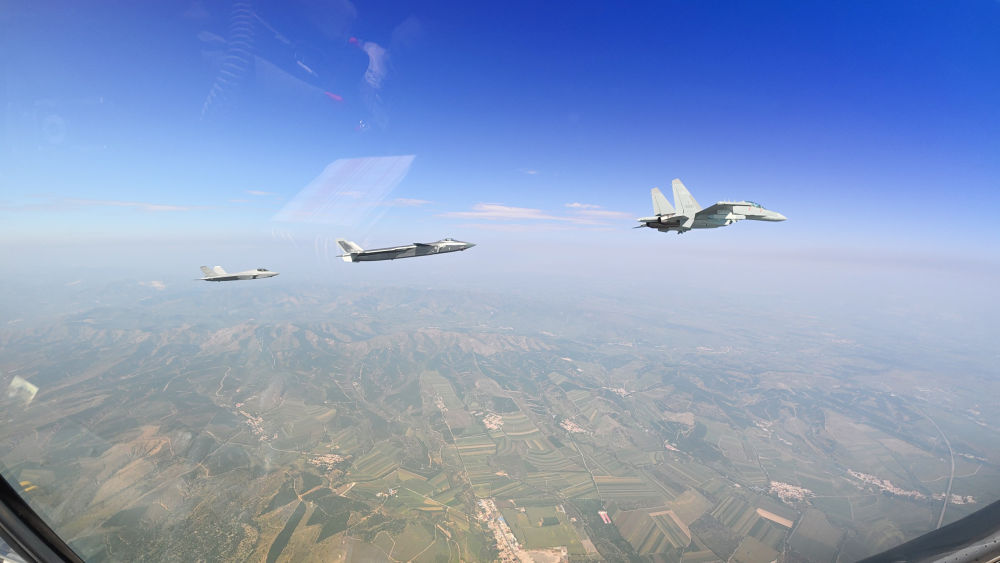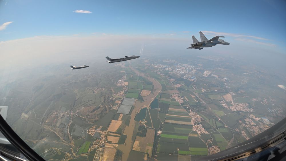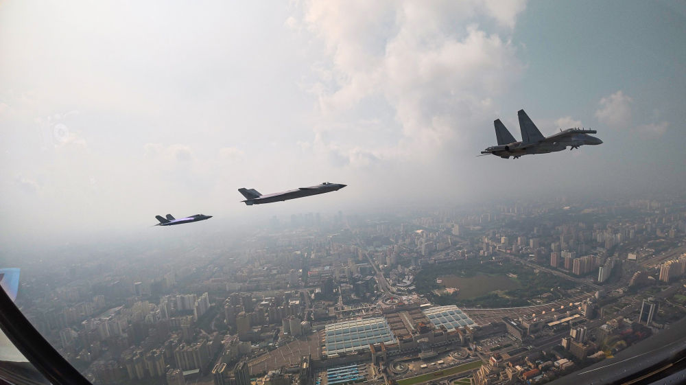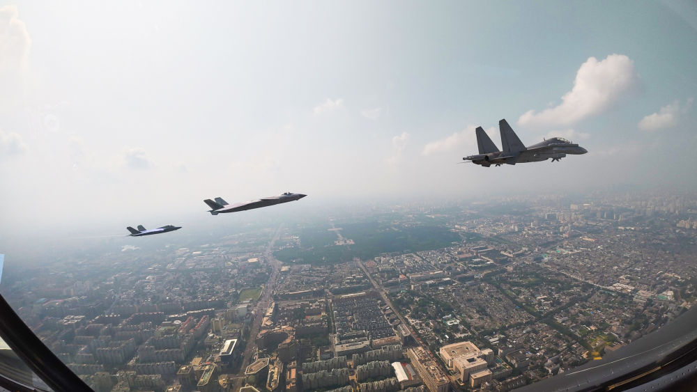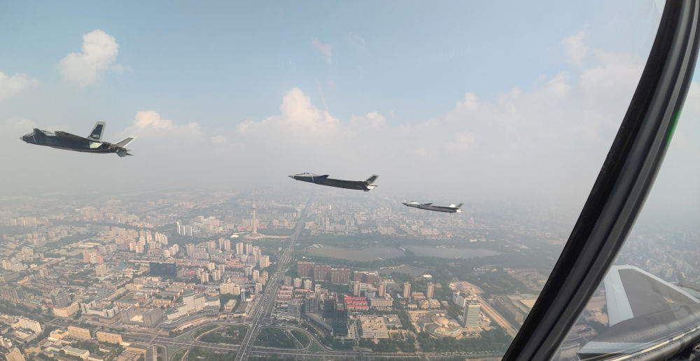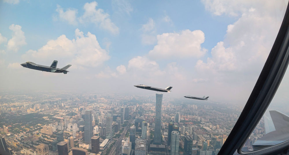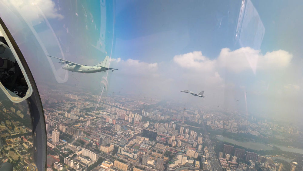↑這是殲擊機(jī)梯隊(duì)從北京城區(qū)上空飛過。