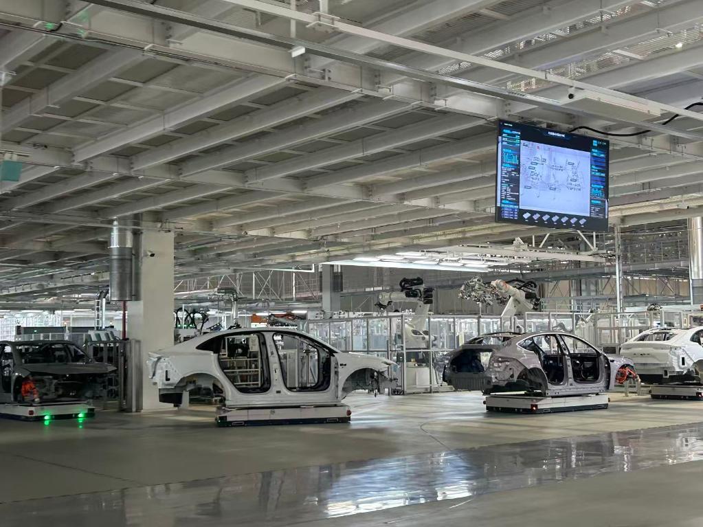 合肥市新橋智能電動汽車產(chǎn)業(yè)園蔚來第二工廠內(nèi)拍攝的新能源汽車生產(chǎn)線。新華社記者吳慧珺 攝