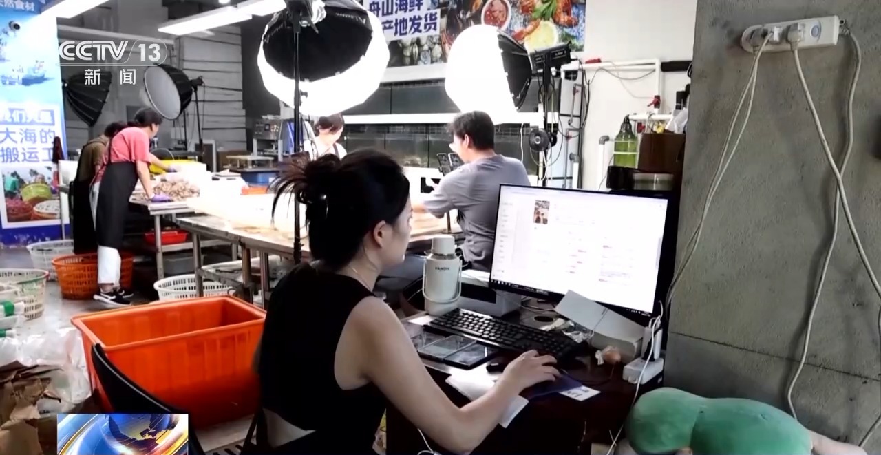 漁船忙著卸貨的同時,在距離碼頭不遠(yuǎn)的電商產(chǎn)業(yè)園里,主播們正售賣新鮮上市的梭子蟹。為了縮短發(fā)貨時間,這家店鋪在直播的同時打包海鮮,即買即發(fā),每天可以發(fā)出六到七百個訂單。