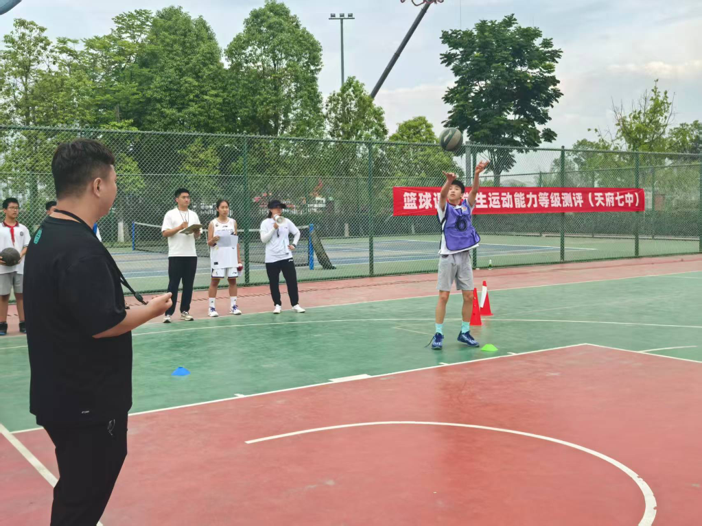 走進(jìn)成都天府第七中學(xué)體育館,墻上張貼著足球、籃球、排球等項(xiàng)目的課程運(yùn)動(dòng)能力等級標(biāo)準(zhǔn),十分醒目。學(xué)生們正按照標(biāo)準(zhǔn)要求進(jìn)行籃球練習(xí),他們一邊觀察墻上的動(dòng)作示意圖,一邊調(diào)整手型和力度,控制籃球的反彈高度和節(jié)奏。