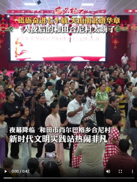 夜幕降臨后,和田市肖爾巴格鄉(xiāng)合尼村新時代文明實(shí)踐站熱鬧非凡。村民們自發(fā)編排舞蹈,有的放聲歌唱、有的盡情起舞,紛紛在舞臺上亮出本領(lǐng)、一展風(fēng)采。精彩的文體活動,為村民送上 “家門口的文化大餐”,既帶來歡聲笑語,也獻(xiàn)上視覺盛宴,更讓大家的生活滿是幸福滋味。