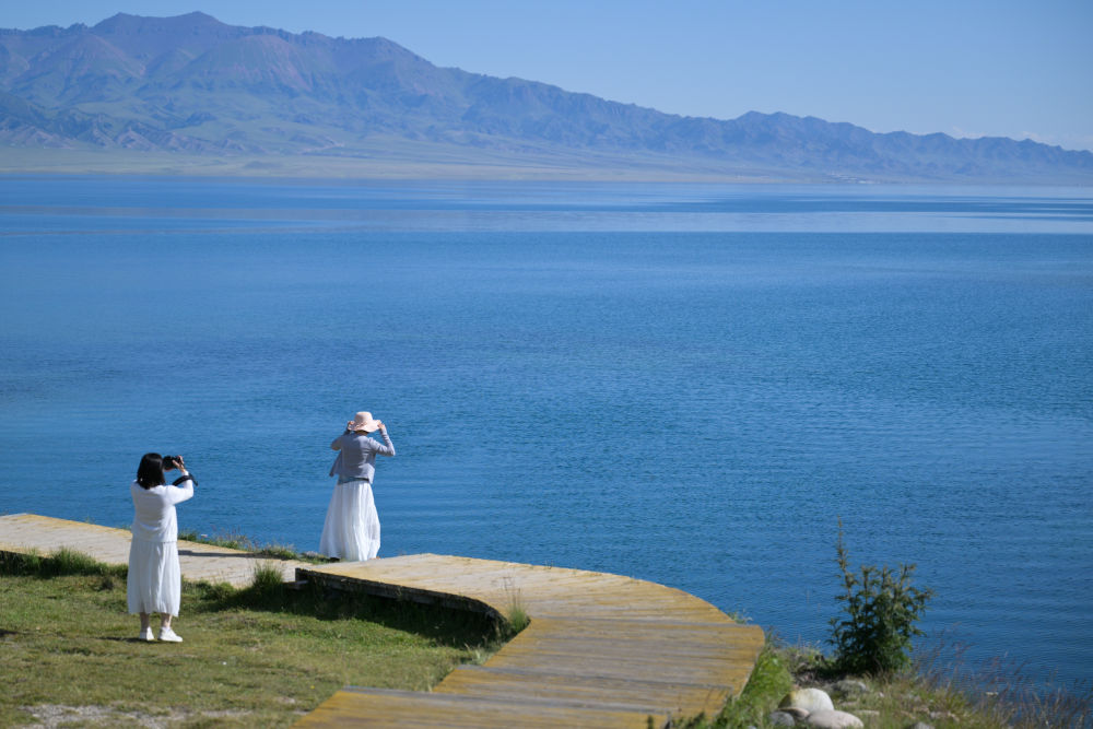 ↑ 游客在賽里木湖畔游玩、拍照(7月9日攝)。