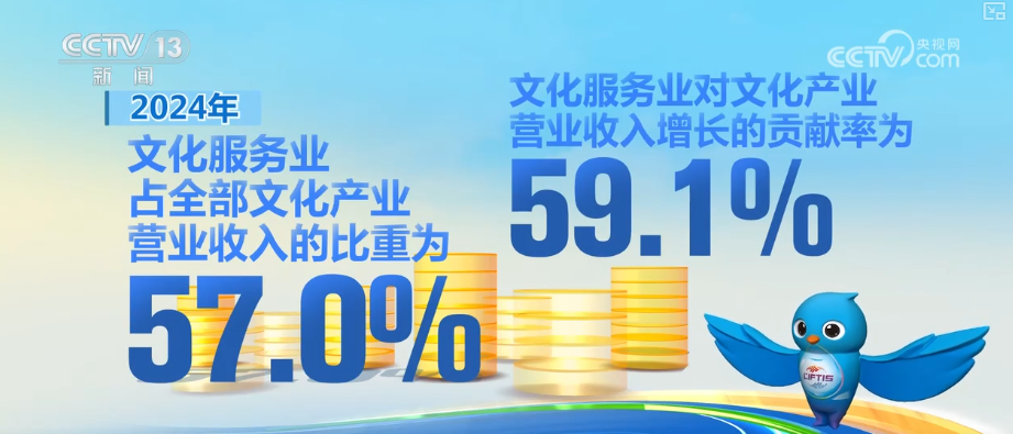 2024年,全國文化產(chǎn)業(yè)實現(xiàn)營業(yè)收入191423億元,營收規(guī)模再創(chuàng)歷史新高,比上年增長7.1%。2024年,文化服務(wù)業(yè)實現(xiàn)營業(yè)收入109134億元,比上年增長7.4%,占全部文化產(chǎn)業(yè)營業(yè)收入的比重為57.0%,文化服務(wù)業(yè)對文化產(chǎn)業(yè)營業(yè)收入增長的貢獻率為59.1%。