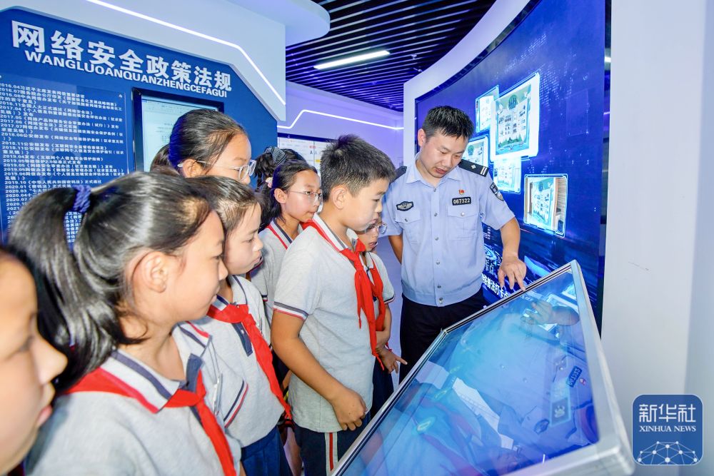 9月15日,在山東省青島市市北區(qū)延安二路小學(xué)開展的網(wǎng)絡(luò)安全教育主題活動上,民警為學(xué)生們講解防范電信詐騙小常識。新華社發(fā)(王海濱攝)