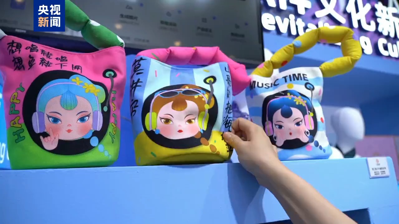總臺央視記者 張歆:在人工智能專館,除了有炫酷的機器人,我們可以看到,這個水桶包就是由人工智能提供靈感的,以劉三姐為IP形象的文創(chuàng)產品。那么這個水桶包還引用了劉三姐山歌的內容,“山歌能把海填平”。