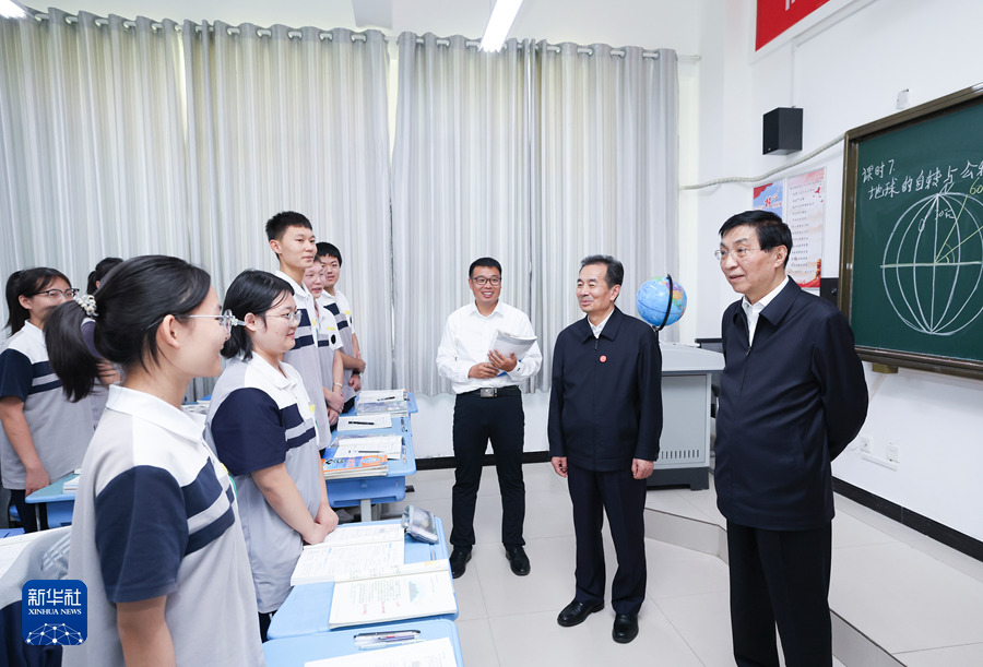 9月25日下午,受習近平總書記囑托,中共中央政治局常委、全國政協(xié)主席、中央代表團團長王滬寧帶領(lǐng)中央代表團部分成員在巴音郭楞蒙古自治州庫爾勒市看望慰問當?shù)馗髯甯刹咳罕?。這是王滬寧和中央代表團部分成員在庫爾勒市第二十三中學(xué)考察教育援疆情況。新華社記者 姚大偉 攝