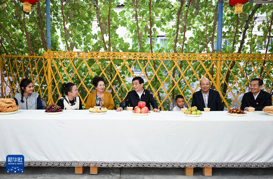 9月25日下午,受習近平總書記囑托,中共中央政治局常委、全國政協(xié)主席、中央代表團團長王滬寧帶領(lǐng)中央代表團部分成員在巴音郭楞蒙古自治州庫爾勒市看望慰問當?shù)馗髯甯刹咳罕?。這是王滬寧和中央代表團部分成員在庫爾勒市阿瓦提鄉(xiāng)吾夏克鐵熱克村了解鄉(xiāng)村產(chǎn)業(yè)發(fā)展和群眾生產(chǎn)生活情況。新華社記者 張領(lǐng) 攝