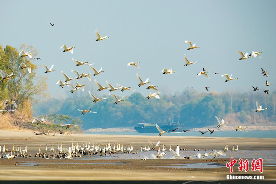新濟洲段長江沿岸,小天鵝伴隨貨物船只飛翔。園方供圖