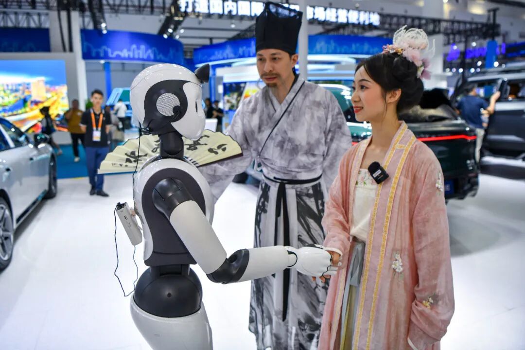 2024年4月15日,海南??冢谒膶弥袊?guó)國(guó)際消費(fèi)品博覽會(huì)上,身著漢服的參觀者與“柔美人形智能服務(wù)機(jī)器人”互動(dòng)。中新社記者 駱云飛 攝