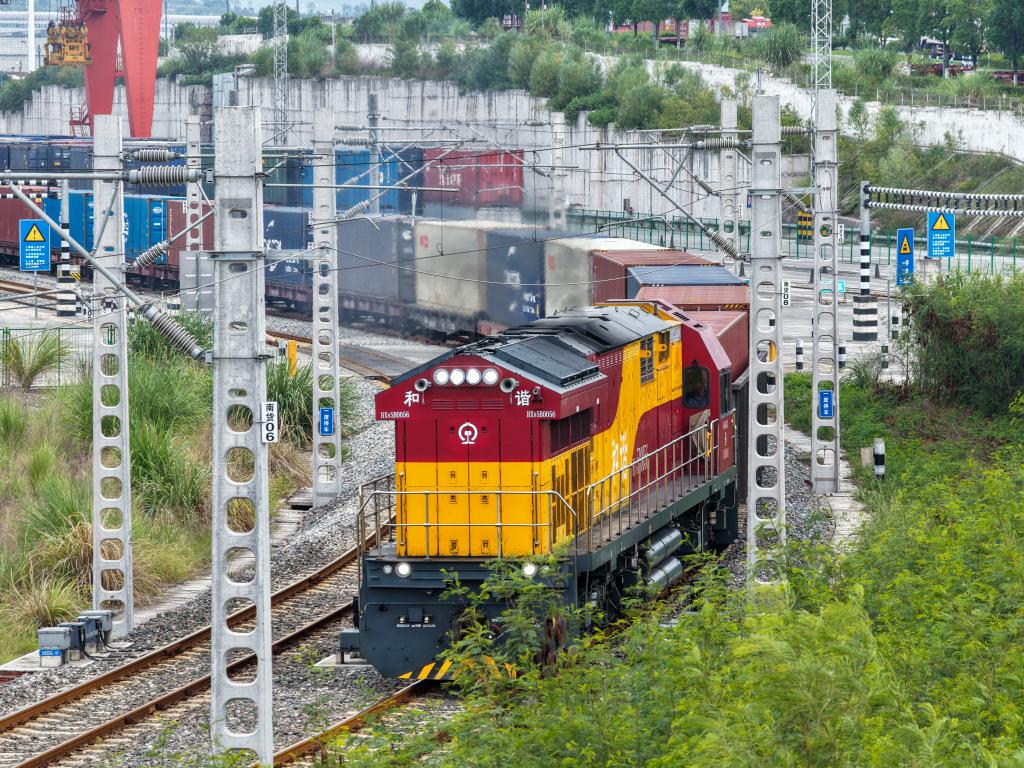 現(xiàn)場調(diào)度員逐一檢查集裝箱,龍門吊有條不紊地裝載貨物,班列司機認真進行發(fā)車前最后檢查……國慶中秋假期里的清晨,位于中國西部直轄市重慶的團結(jié)村中心站延續(xù)著日常的喧鬧。