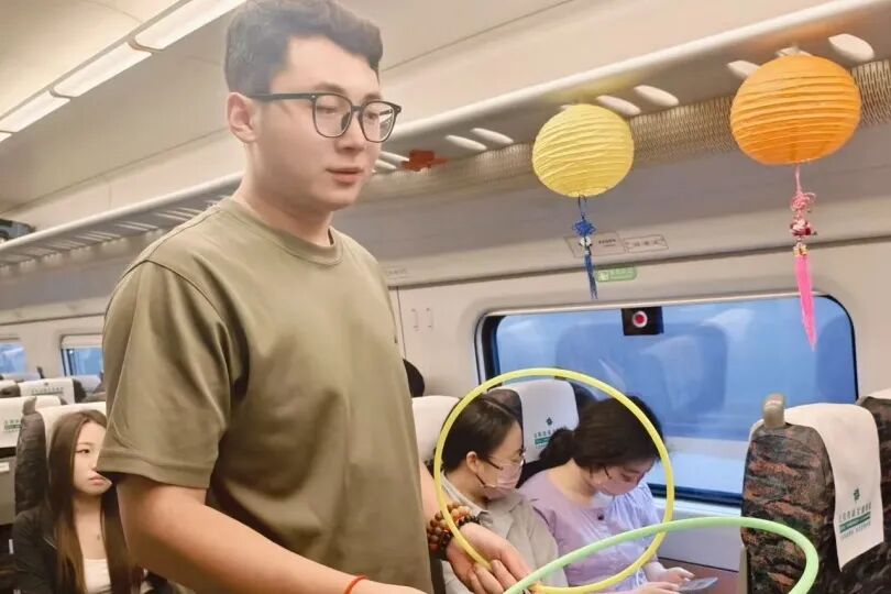 車廂內(nèi),懸掛的燈籠點(diǎn)綴出濃濃節(jié)日氣息。青年職工演唱歌曲《看月亮爬上來(lái)》,熟悉的旋律引發(fā)旅客共鳴;“舉頭望明月(打一中藥名)”等趣味猜燈謎活動(dòng),吸引不少旅客踴躍參與;身著漢服的乘務(wù)員帶領(lǐng)孩子們玩起傳統(tǒng)套圈游戲,月餅、玩偶作獎(jiǎng)品,歡聲笑語(yǔ)不斷。