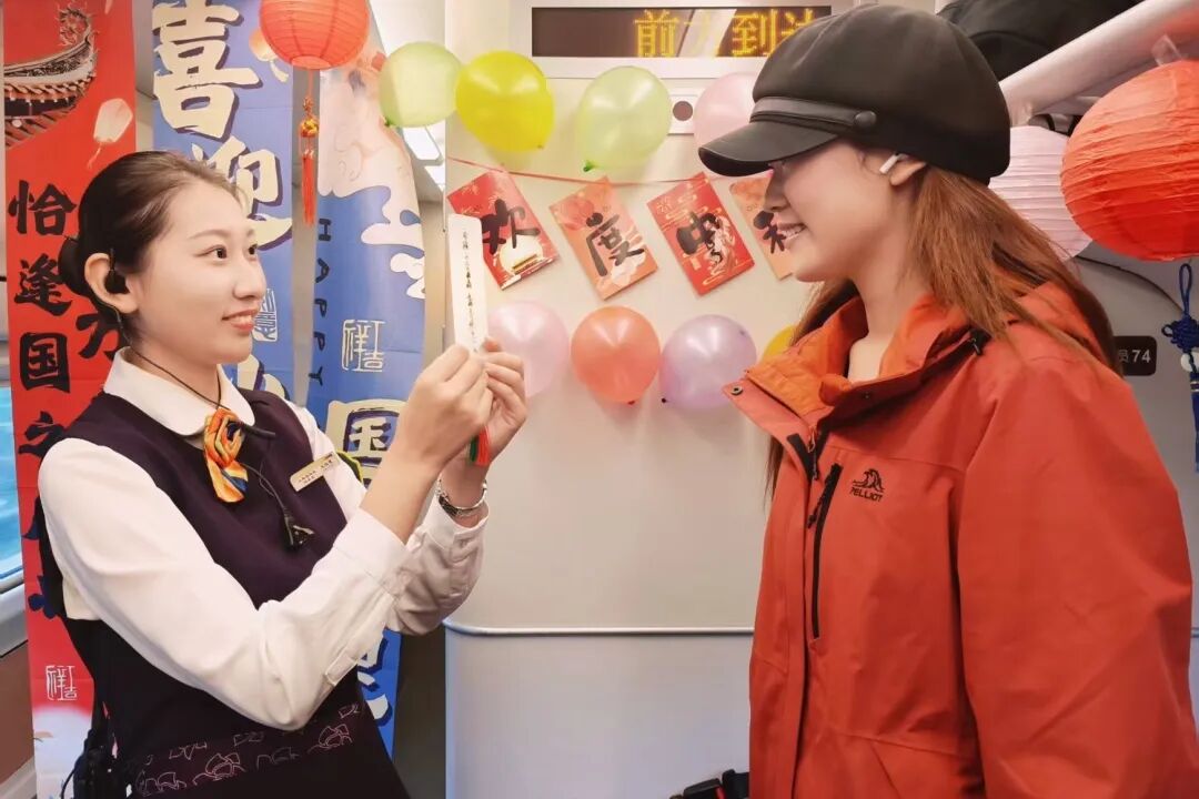 熱鬧的活動(dòng)讓車廂變成歡樂(lè)的海洋,列車員將月餅等精美伴手禮送給旅客,為他們送上節(jié)日的祝福。