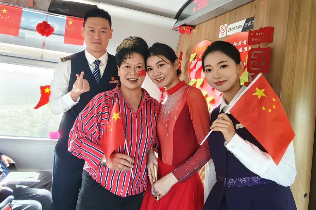 車廂內(nèi)掛滿條幅、彩帶和中國(guó)結(jié),洋溢著節(jié)日的喜慶氛圍。在舞蹈《親愛(ài)的你啊》的優(yōu)美旋律中,列車聯(lián)歡拉開序幕。