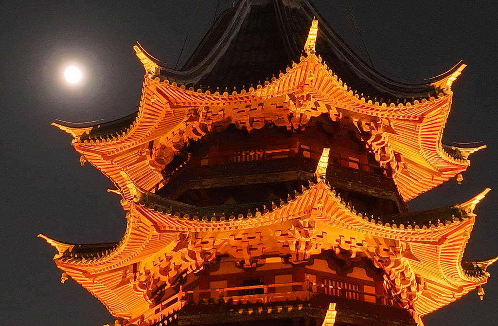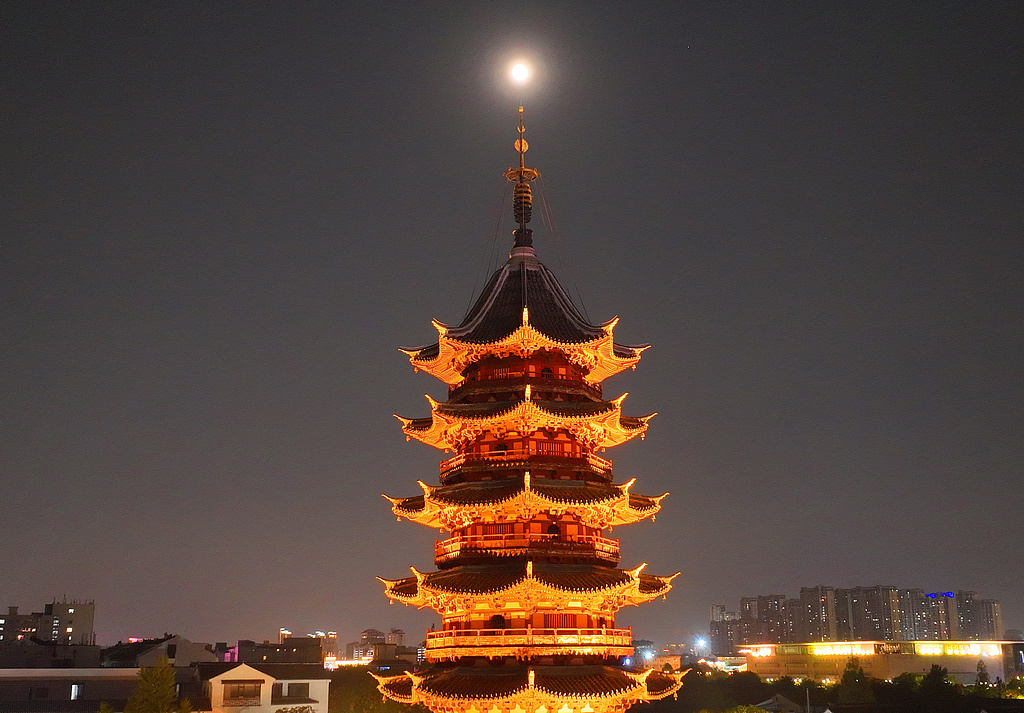 江蘇蘇州古城夜空一輪中秋明月與千年瑞光塔交相輝映。